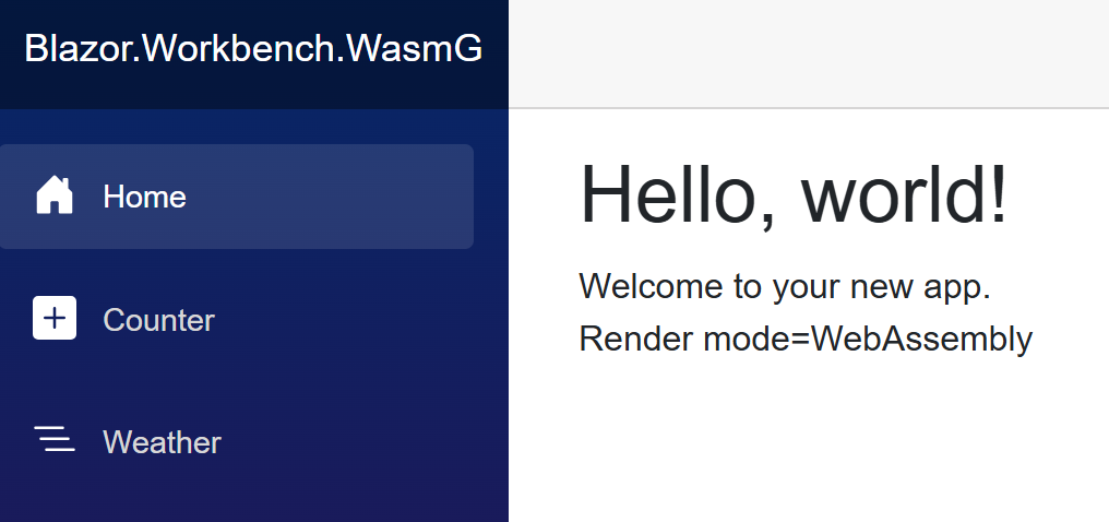 Repeat the process of removing the pages and configuring the other apps in the solution. When you run the second app, you will see that the title of the app is Blazor.Workbench.AutoG. The title is hard coded into the NavMenu.razor file in the RCL. We need to have the correct title for each app.