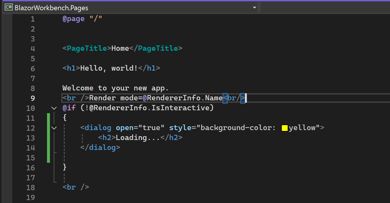 Modify the Home.razor page in the RCL as show in the image. Use RenderInfo property to display the current render mode name and to display the Loading dialog when not in active mode. The WasmG version of the app will take the longest to download to the client. Run the WasmG version of the app. When the home page is first displayed it shows render mode as Static and displays the loading message. Then in a few seconds, it changes to Web Assembly and the loading message is gone.