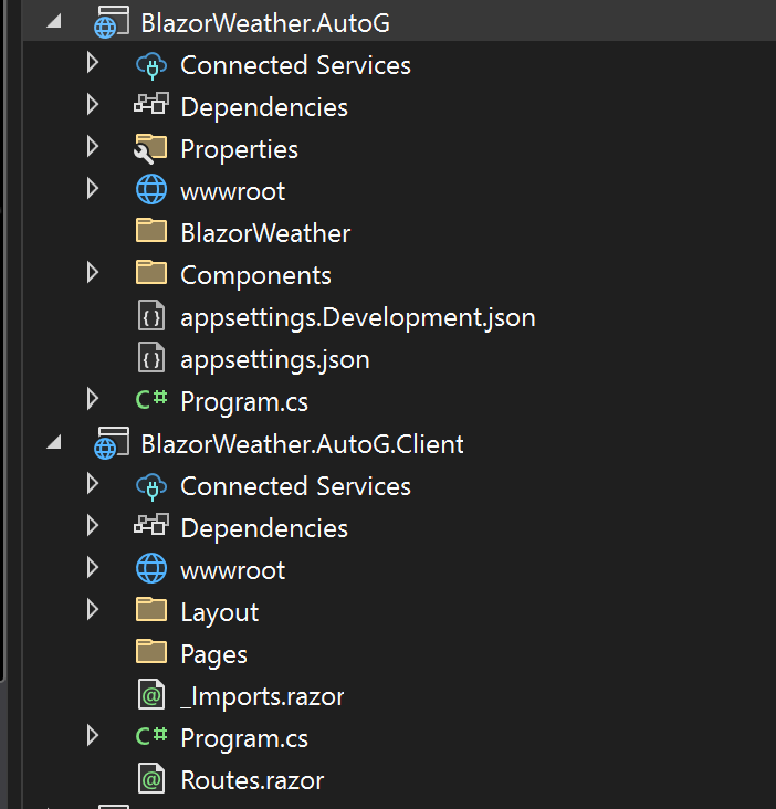 Each project will contain the same sample Weather app. In lesson 2 we will create a Razor Class Library (RCL) and copy the Weather app to it. Then delete the Weather app components from the Blazor projects and configure the projects to run the app from the RCL.