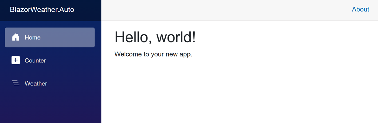 Create a new Blazor Web App project in a new solution named BlazorWorkbench. Name the project BlazorWorkbench.AutoG. Interactive mode is Auto and interactive location is global.