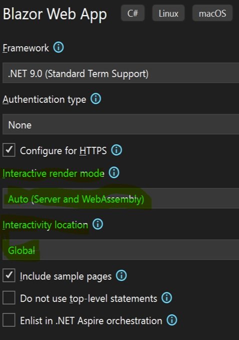 In Visual Studio and Dot Net 9, Blazor Webapps are created with the Blazor Web App template. The template has two parameters you need to understand.